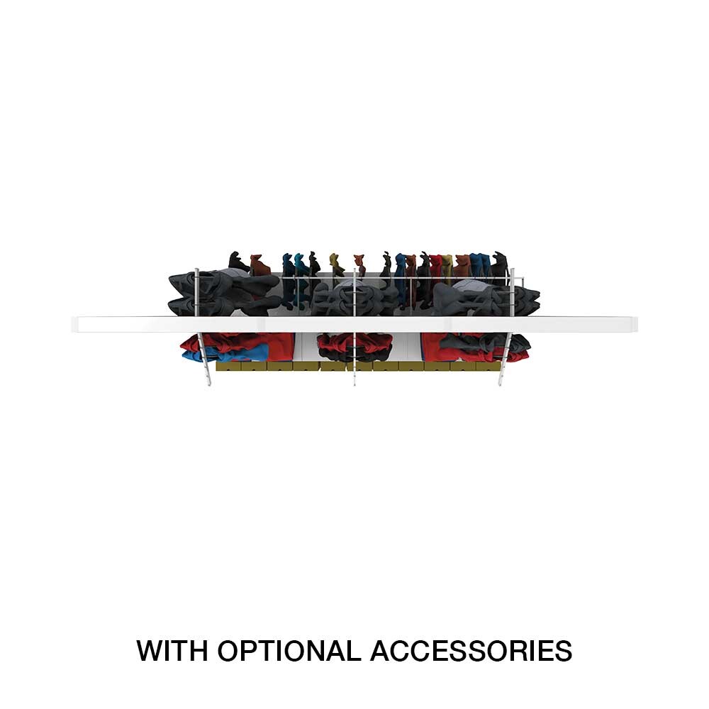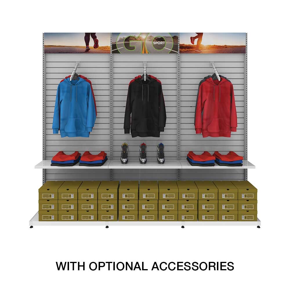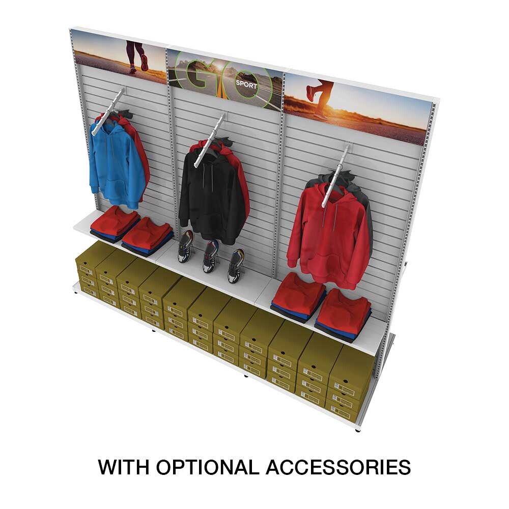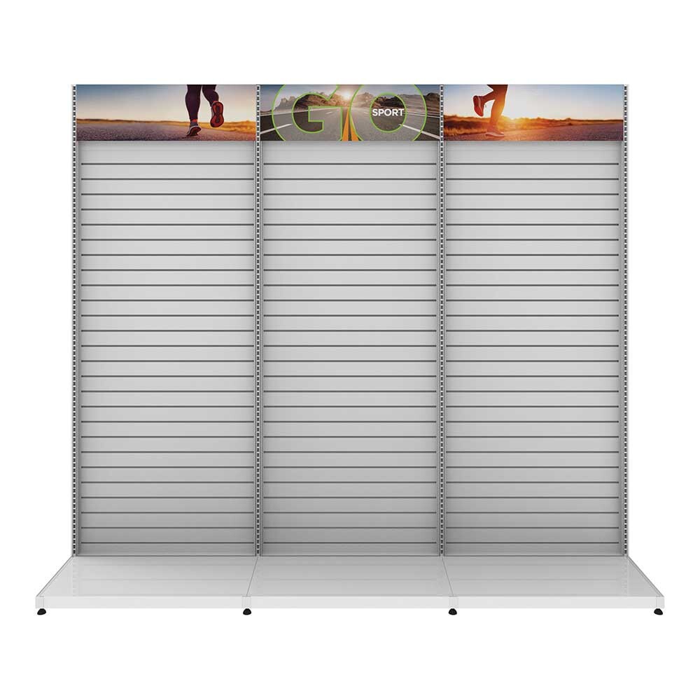 MODify Double Sided Kit 04 features three double-sided slatwall panels and six SEG push-fit graphic headers. Create the perfect layout of fixtures such as hooks, shelves, waterfalls and bars for this adaptable retail display.