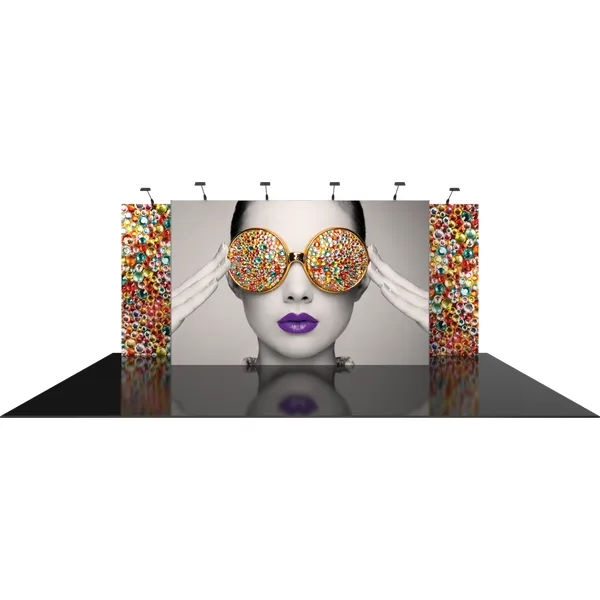 The 10ft x 20ft inline Vector Frame™ Kit 26 is a robust modular exhibit that has a lot of bells and whistles! Extrusion frames are coupled with push-fit SEG graphics to create a sleek, seamless appearance. Functionality is delivered with a storage closet, slot wall for hanging merchandise and a monitor mount to hang a TV for promotional use.